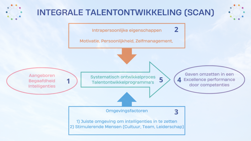 • Integrale (talent) ontwikkeling is een holistische benadering voor het ontwikkelen van de intelligenties, talenten en competenties van mensen, vanuit een open kijk en een brede scope aan invalshoeken.